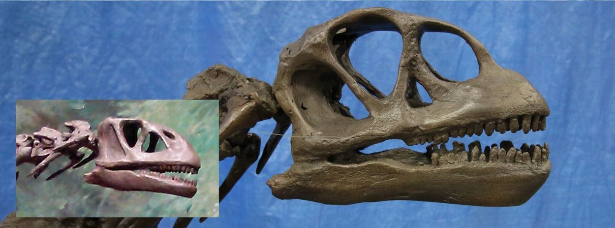 18.5 foot Yangchuanosaurus skeleton cast. Rebuilt to be disassembled and assembled easily for a traveling exhibit, original in the inset.